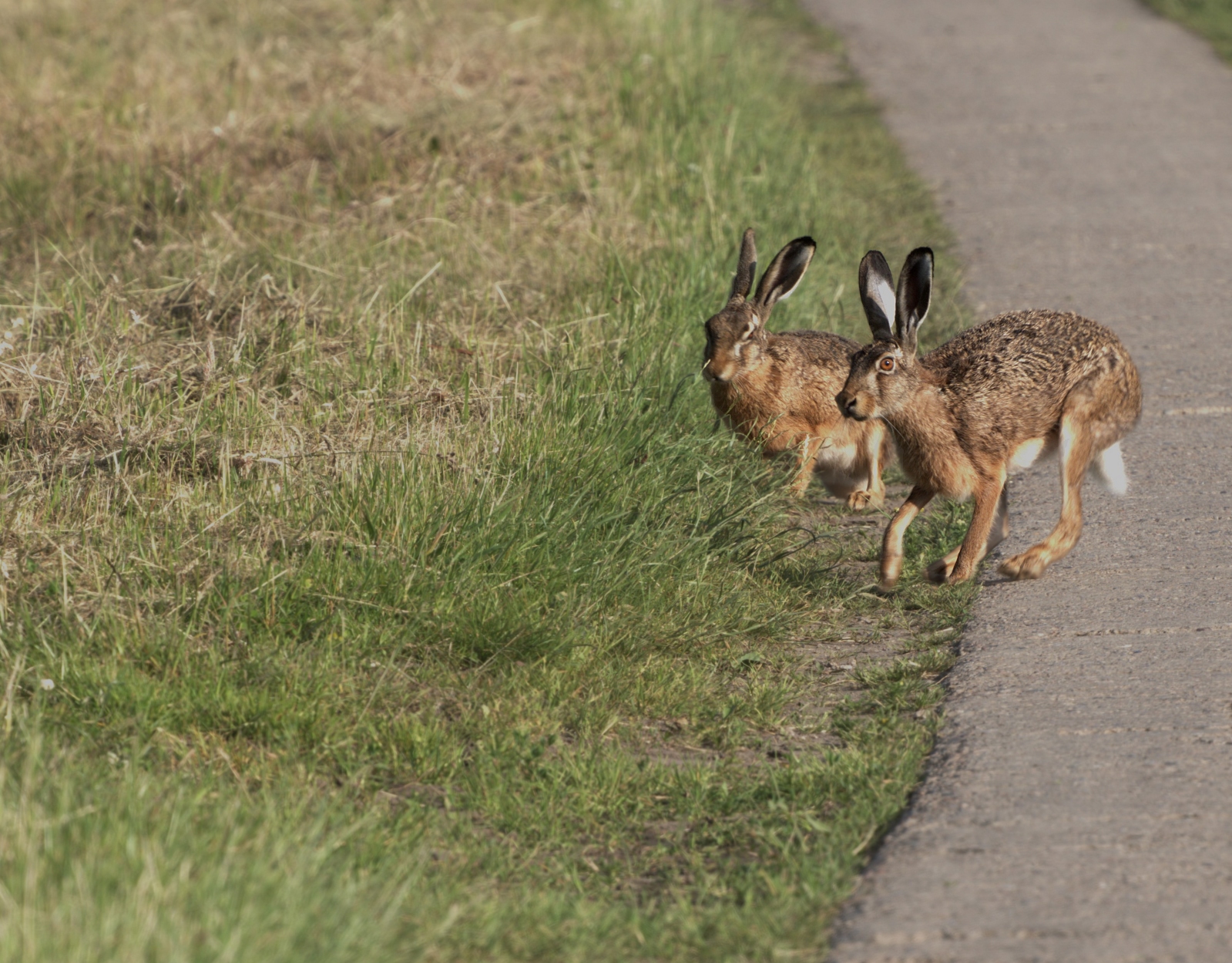 Als Zugabe zu meinen Vogelbeobachtungen laufen mir abends öfter Feldhasen vor die Kamera.