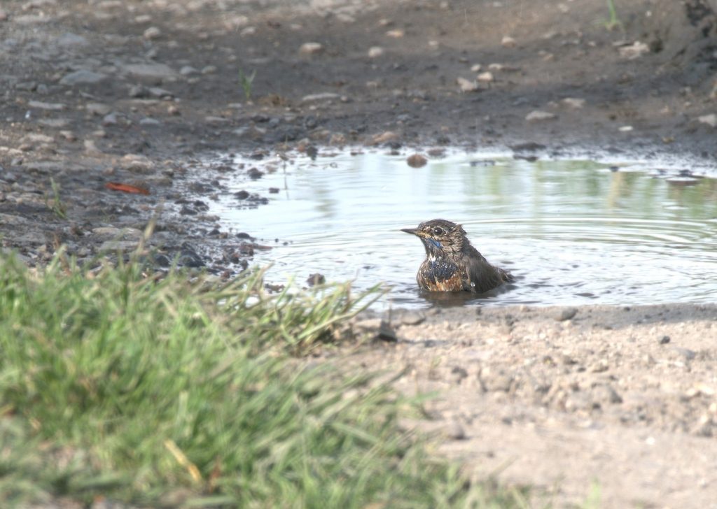 Hier hatte sich meine Geduld gelohnt. Nach einer ganzen Weile wagte sich das Blaukehlchen in die Pfütze und genoss das Plantschen, mich dabei im Auge behaltend.
