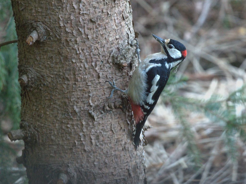 Im Herbst kommen die Spechte wieder vom nahen Wäldchen an den Futterplatz.
