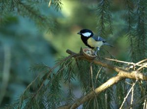 Die junge Kohlmeise hat es fast geschafft, ihre Geschwister sind schon draußen in der Nähe.