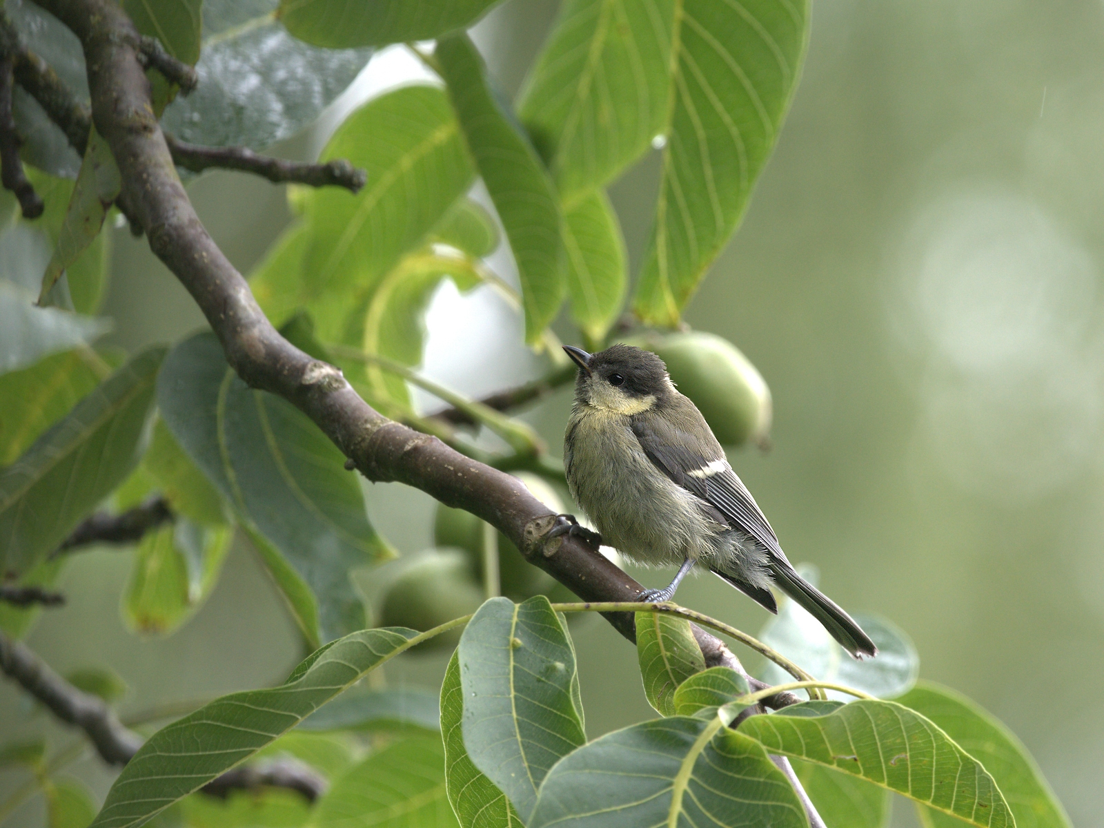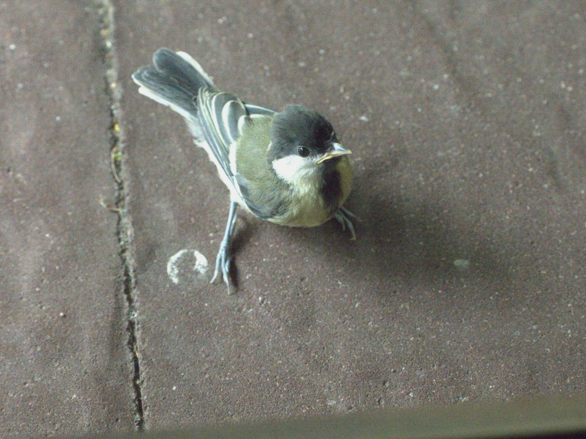 Die gerade aus dem Nest geflogene junge Kohlmeise flatterte gegen die Fensterscheibe, aber nichts ist passiert.