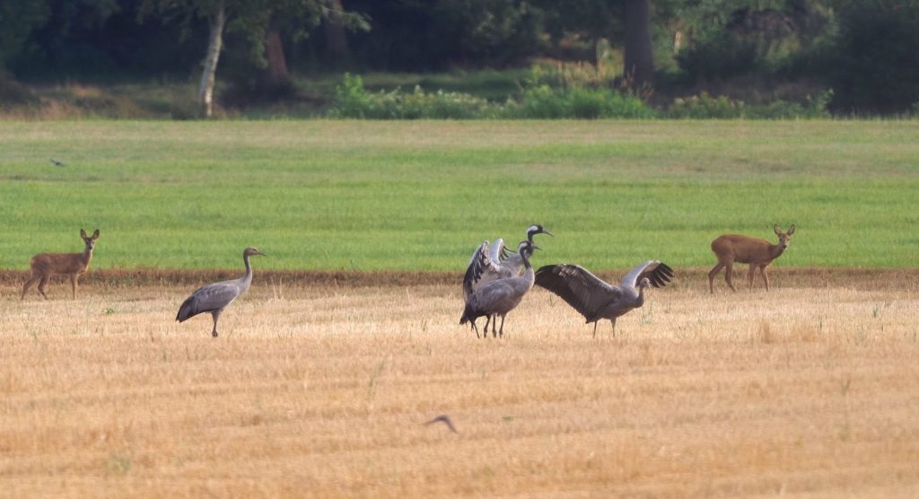 Ein einziges Paar mit 2 Jungen (braune Köpfe) gibt es in meiner unmittelbaren Nähe. Hoffentlich überleben sie die Vogelgrippe! Von den Rehen lassen sie sich nicht stören.