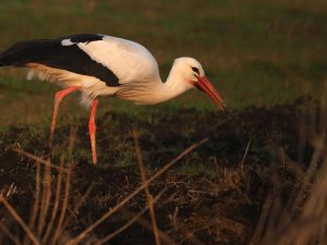 Noch in der Dämmerung sucht der Storch nach Futter und bringt es zum Teil dem brütenden Partner/der Partnerin in's Nest.