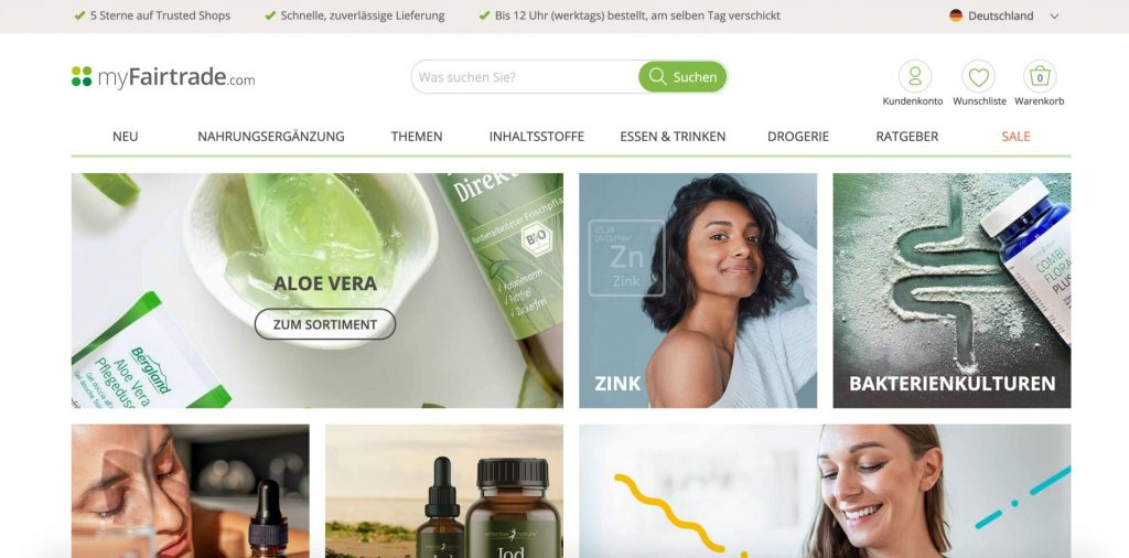 Der Onlineshop myFairtrade.com setzt vor allem auf natürliche Gesundheitsprodukte. Viele der Produkte stammen aus der Region und das Unternehmen nutzt zudem recycelbare Verpackungen und den umweltschonenden Versand mit DHL GoGreen. Dieser Händler ist zu empfehlen.