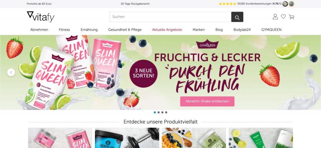 Im Fokus von vitafy.de steht der Verkauf und die Herstellung von Abnehm-, Fitness- und Nahrungsergänzungs-Produkten. Die Schwerpunkte des Shops sind daher u.a. Fitness, Abnehmen, Ernährung sowie Vitamine & Co.